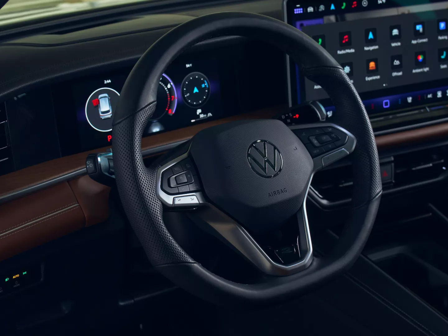 Every 2025 VW Tiguan comes standard with Volkswagen Digital Cockpit Pro, offering a fully digital, customizable driver display. The 12.9-inch touchscreen anchors the cabin, with an available 15-inch upgrade for even more control.
