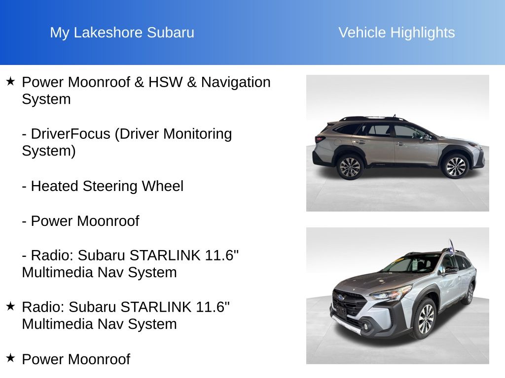 Outback Limited, Ice Silver Metallic, *ALL WHEEL DRIVE*, *APPLE CARPLAY & ANDROID AUTO*, *EYESIGHT Driver Assist*, *LANE DEPARTURE WARNING*, *LEATHER HEATED POWER SEATS*, *MOONROOF*, *OIL CHANGES for LIFE*, *REARVIEW CAMERA*, DriverFocus (Driver Monitoring System), Heated Steering Wheel, Power Moonroof, Power Moonroof & HSW & Navigation System, Radio: Subaru STARLINK 11.6" Multimedia Nav System. Certified. Ice Silver Metallic 2023 Subaru Outback Limited AWD CVT Lineartronic 2.5L 4-Cylinder DOHC 16V