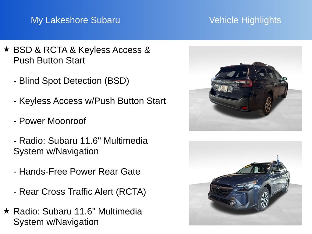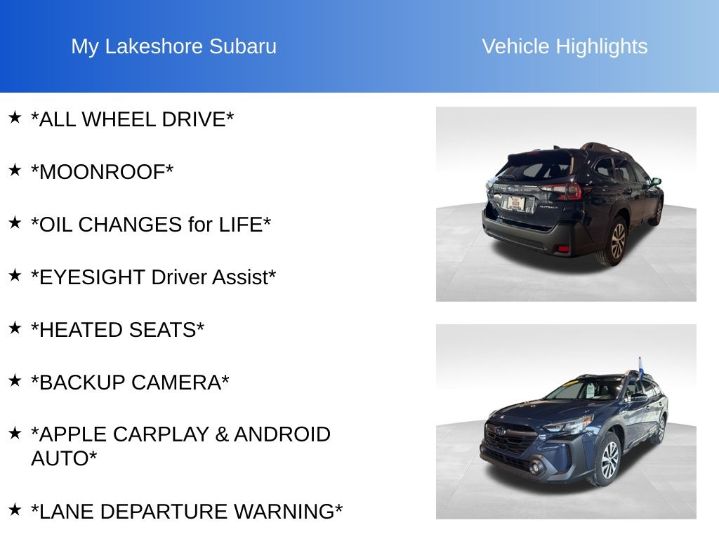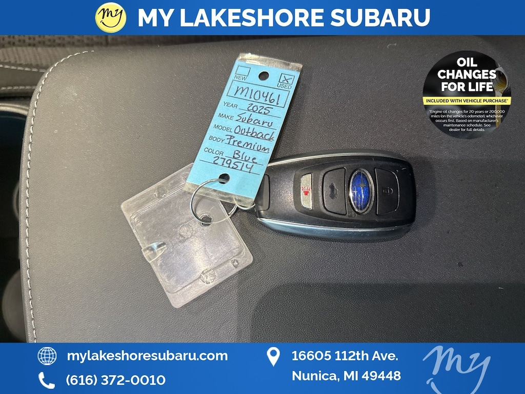 Outback Premium, Cosmic Blue Pearl, *ALL WHEEL DRIVE*, *APPLE CARPLAY & ANDROID AUTO*, *BACKUP CAMERA*, *EYESIGHT Driver Assist*, *HEATED SEATS*, *LANE DEPARTURE WARNING*, *MOONROOF*, *OIL CHANGES for LIFE*, Blind Spot Detection (BSD), BSD & RCTA & Keyless Access & Push Button Start, Hands-Free Power Rear Gate, Keyless Access w/Push Button Start, Power Moonroof, Radio: Subaru 11.6" Multimedia System w/Navigation, Rear Cross Traffic Alert (RCTA). Certified. Cosmic Blue Pearl 2025 Subaru Outback Premium AWD CVT Lineartronic 2.5L 4-Cylinder DOHC 16V