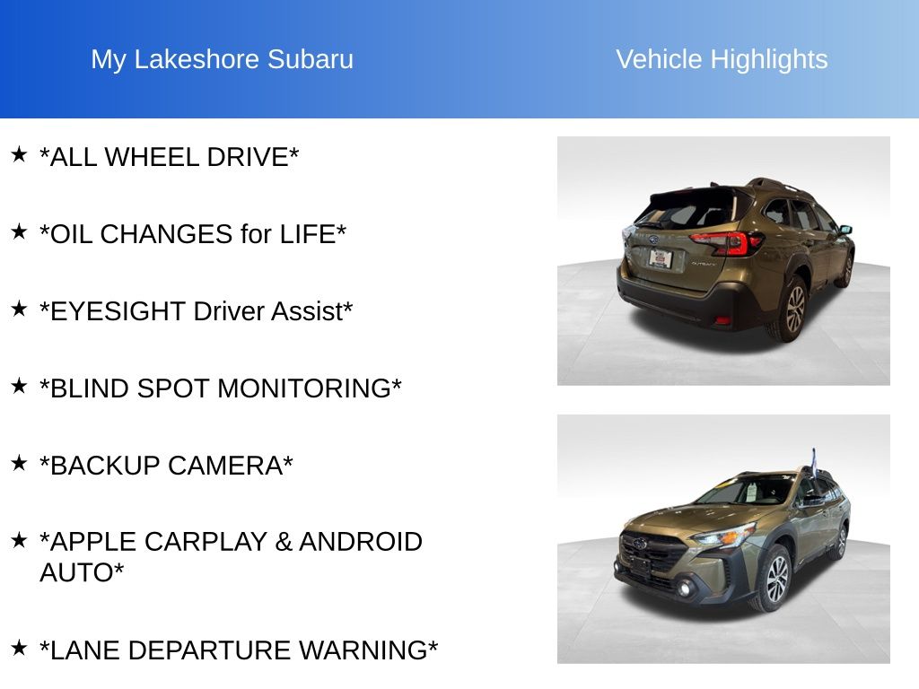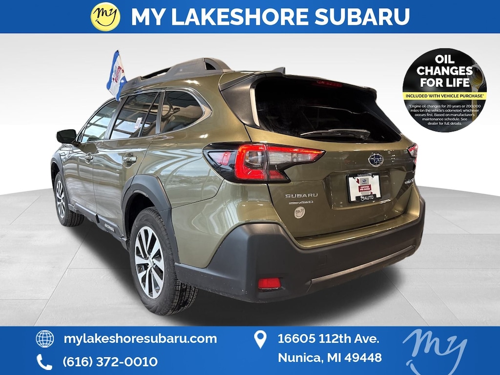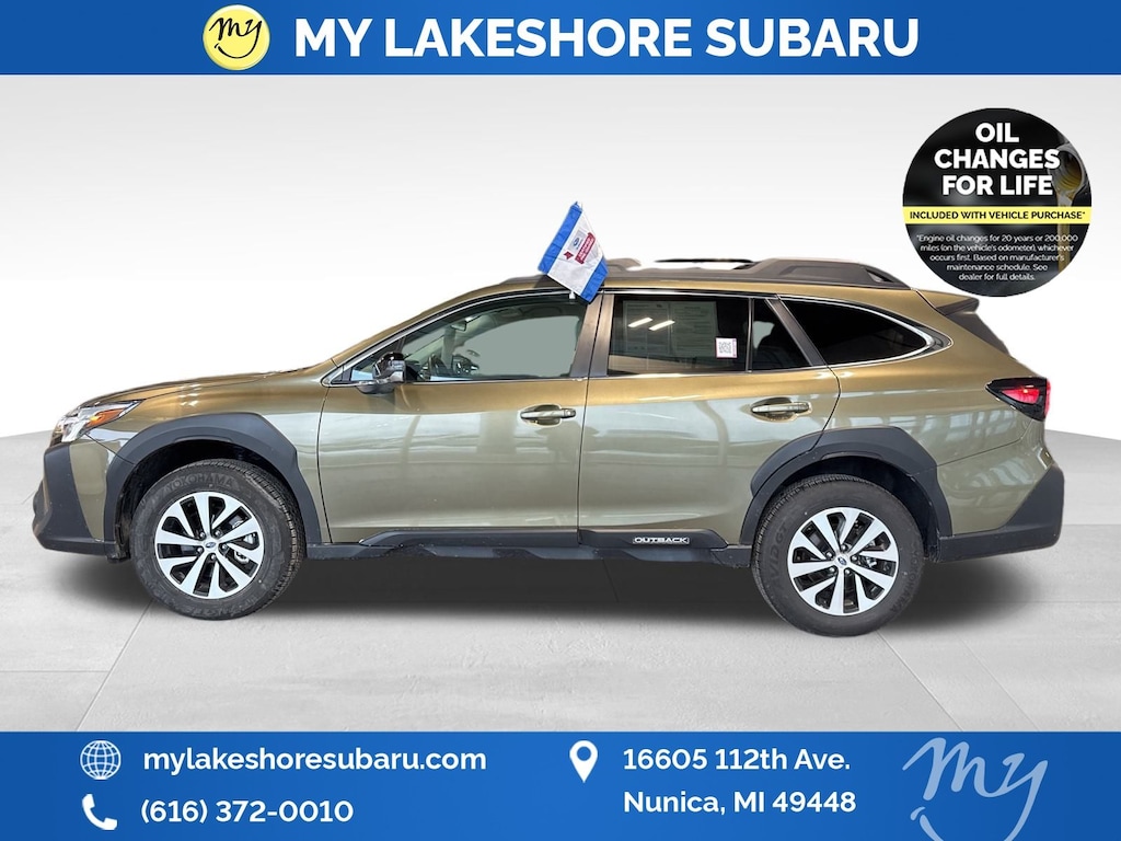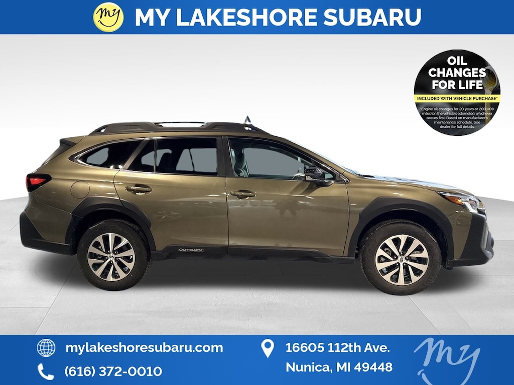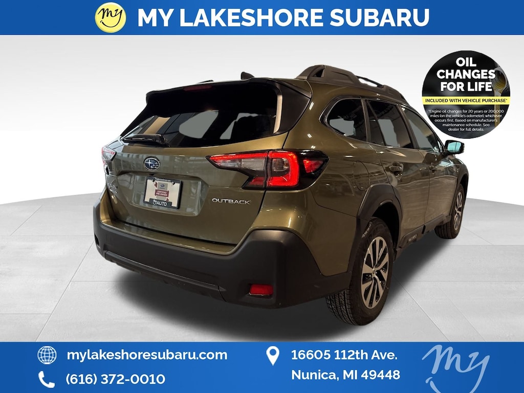 Outback Premium, Autumn Green Metallic, *ALL WHEEL DRIVE*, *APPLE CARPLAY & ANDROID AUTO*, *BACKUP CAMERA*, *BLIND SPOT MONITORING*, *EYESIGHT Driver Assist*, *LANE DEPARTURE WARNING*, *OIL CHANGES for LIFE*, Blind Spot Detection (BSD), BSD w/RCTA & Keyless Access & Push Button Start, Hands-Free Power Rear Gate, Keyless Access w/Push Button Start, Rear Cross Traffic Alert (RCTA). Certified. Autumn Green Metallic 2025 Subaru Outback Premium AWD CVT Lineartronic 2.5L 4-Cylinder DOHC 16V