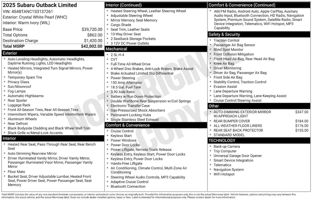 Outback Limited, Crystal White Pearl, *ALL WHEEL DRIVE*, *APPLE CARPLAY & ANDROID AUTO*, *EYESIGHT Driver Assist*, *LANE DEPARTURE WARNING*, *LEATHER HEATED POWER SEATS*, *LOCAL TRADE*, *OIL CHANGES for LIFE*, Navigation system: TomTom Navigation w/what3words. Certified. Crystal White Pearl 2025 Subaru Outback Limited AWD CVT Lineartronic 2.5L 4-Cylinder DOHC 16V