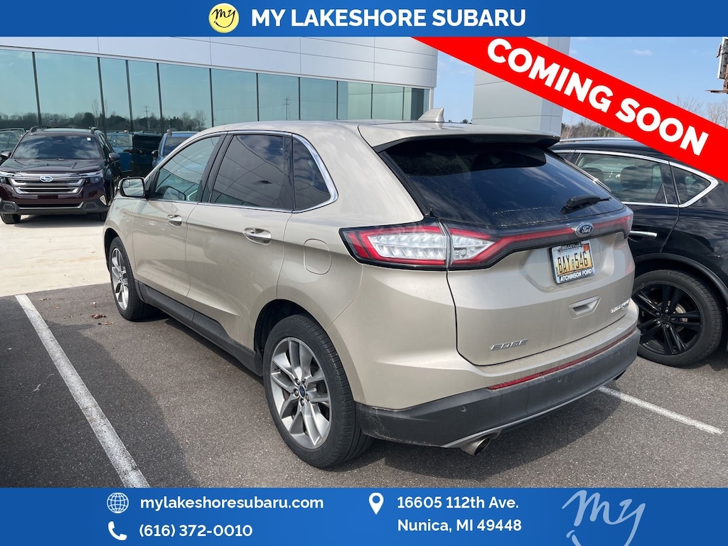 Edge Titanium, AWD, White Gold Metallic, *ALL WHEEL DRIVE*, *BACKUP SENSORS*, *HEATED REAR Seats*, *HEATED STEERING WHEEL*, *LEATHER HEATED POWER SEATS*, *LOCAL TRADE*, *OIL CHANGES for LIFE*, *PANORAMIC MOONROOF*, 110V/150W AC Power Outlet, Cold Weather Package, Equipment Group 301A, Front & Rear Floor Liners, Heated Rear-Seats, Heated Steering Wheel, Leather Trimmed Heated/Cooled Bucket Seats, Panoramic Vista Roof, Power Tilt/Telescoping Steering Column w/Memory, Remote Start System, SiriusXM Traffic & Travel Link, Voice-Activated Touchscreen Navigation System, Windshield Wiper De-Icer. White Gold Metallic 2018 Ford Edge Titanium AWD 6-Speed Automatic EcoBoost 2.0L I4 GTDi DOHC Turbocharged VCT