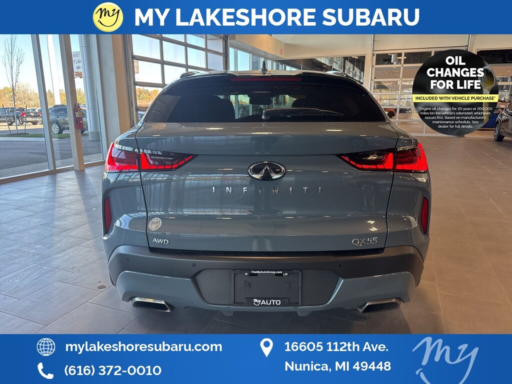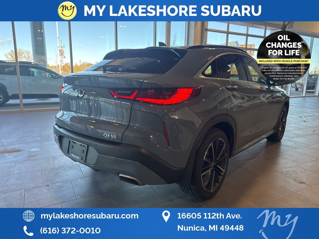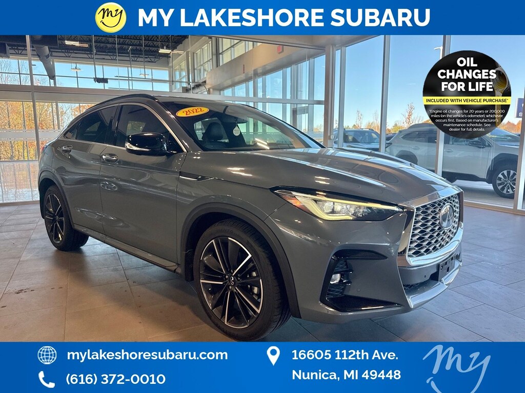 QX55 ESSENTIAL, Slate Gray, *ADAPTIVE CRUISE*, *ALL WHEEL DRIVE*, *APPLE CARPLAY & ANDROID AUTO*, *BLIND SPOT MONITORING*, *LANE DEPARTURE WARNING*, *LEATHER HEATED POWER SEATS*, *LOCAL TRADE*, *OIL CHANGES for LIFE*, Adaptive Front Lighting System, Blind Spot Intervention, Cube Design LED Headlights, Distance Control Assist, Intelligent Cruise Control, Lane Departure Prevention, ProASSIST Package. Slate Gray 2022 INFINITI QX55 ESSENTIAL AWD CVT I4