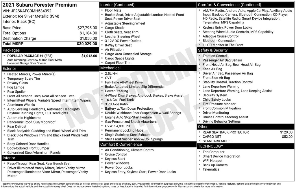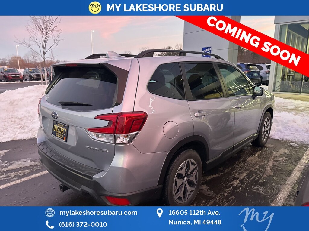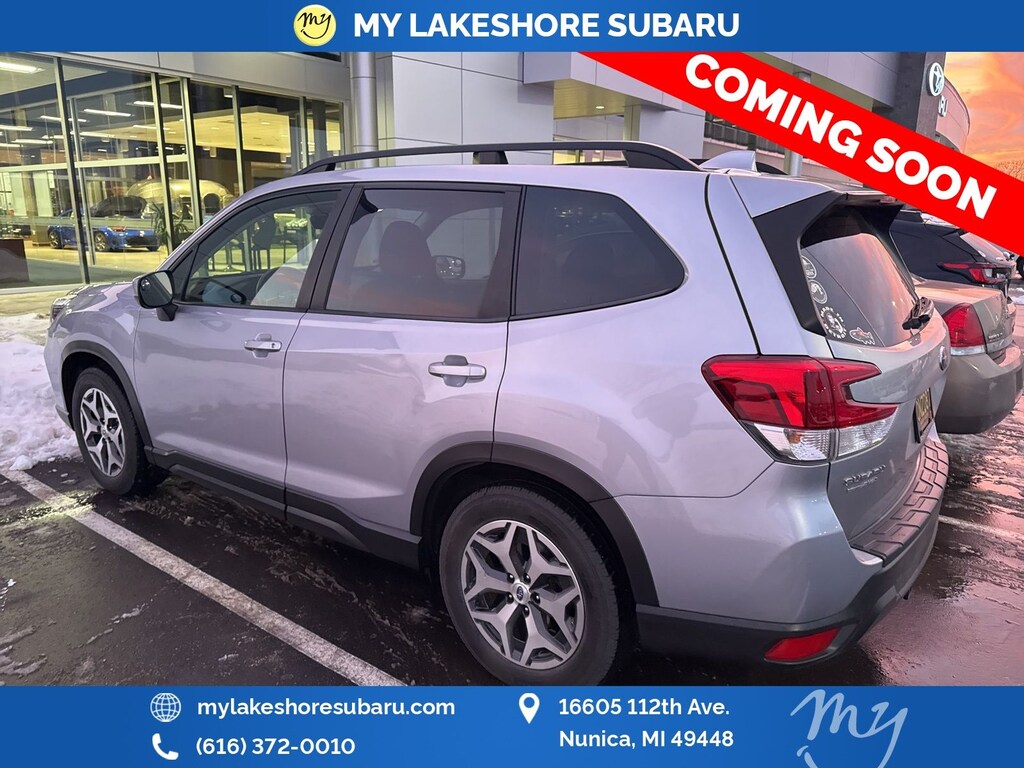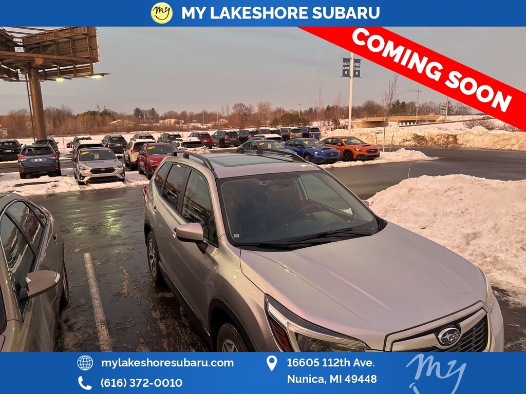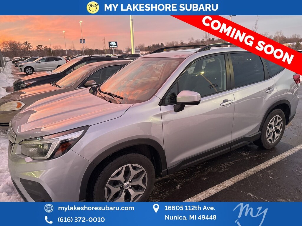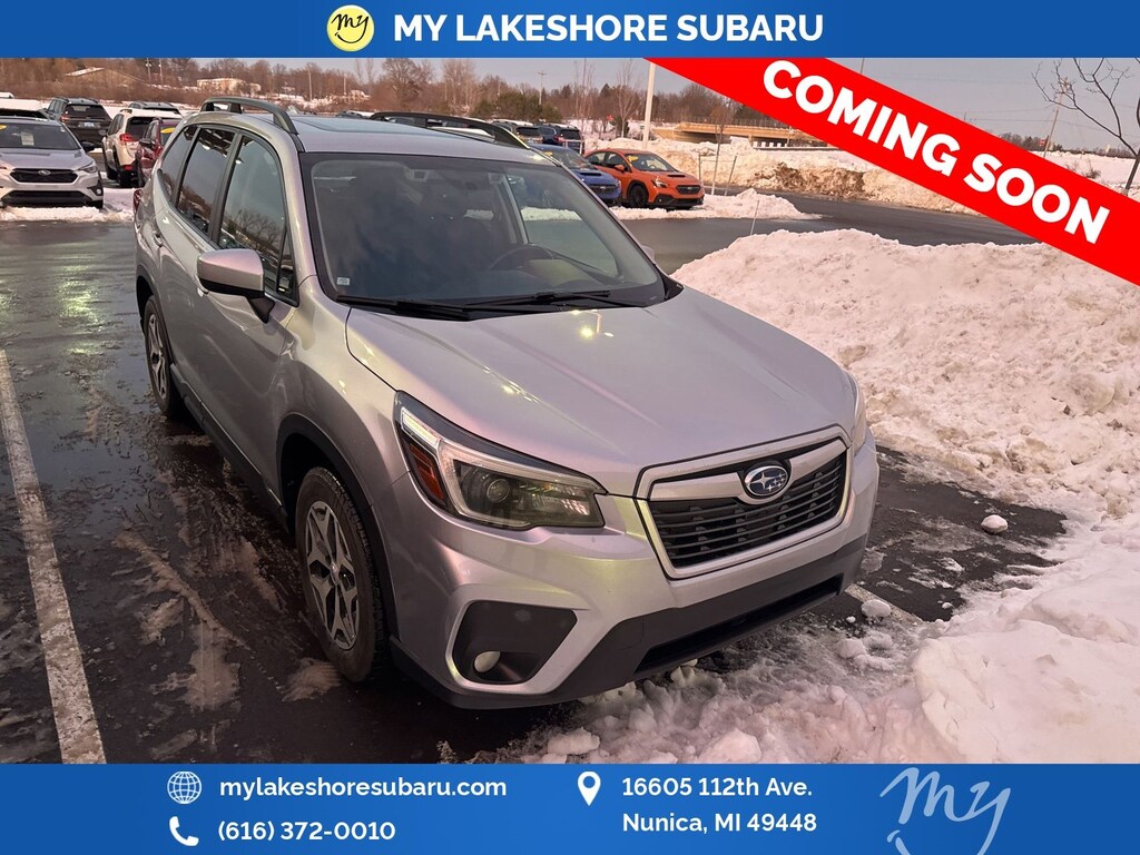 Forester Premium, Ice Silver Metallic, *ALL WHEEL DRIVE*, *APPLE CARPLAY & ANDROID AUTO*, *EYESIGHT Driver Assist*, *HEATED SEATS*, *LANE DEPARTURE WARNING*, *LOCAL TRADE*, *OIL CHANGES for LIFE*, *PANORAMIC MOONROOF*. Ice Silver Metallic 2021 Subaru Forester Premium AWD Lineartronic CVT 2.5L 4-Cylinder DOHC 16V VVT