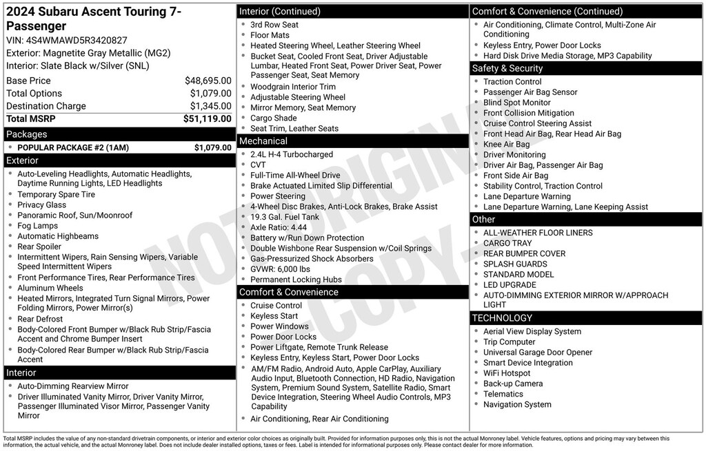 Ascent Touring, Magnetite Gray Metallic, *ALL WHEEL DRIVE*, *APPLE CARPLAY & ANDROID AUTO*, *BLIND SPOT MONITORING*, *EYESIGHT Driver Assist*, *HEATED STEERING WHEEL*, *LANE DEPARTURE WARNING*, *LEATHER HEATED POWER SEATS*, *OIL CHANGES for LIFE*, *PANORAMIC MOONROOF*, *PREMIUM SOUND*. Certified. Magnetite Gray Metallic 2024 Subaru Ascent Touring AWD Lineartronic CVT 2.4L 4-Cylinder DOHC 16V